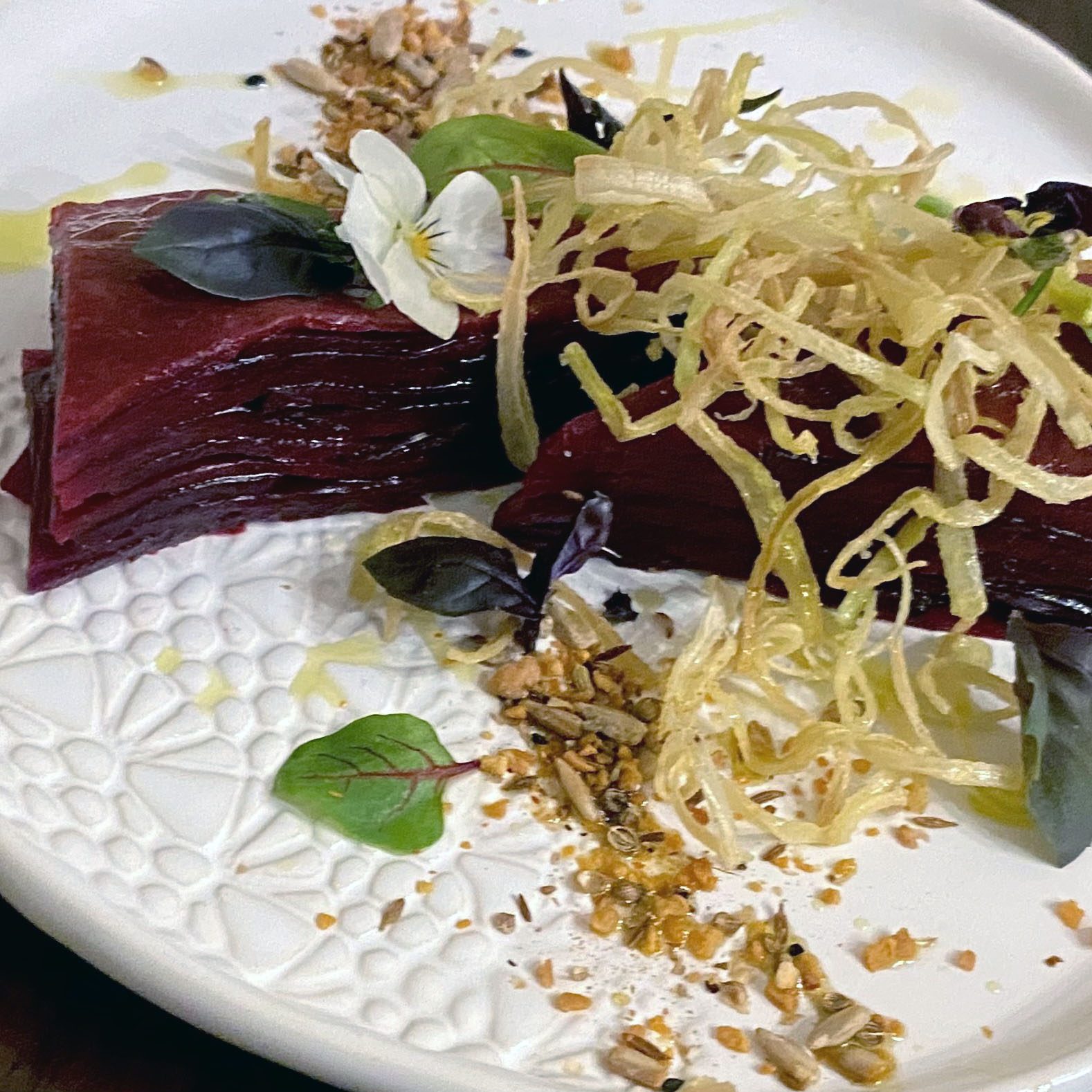 Heat your water bath to 90C. Melt ¾ of your butter with the garlic, sage, and marjoram. Lightly cook at a very low temperature for 20 minutes to infuse garlic and herbs. Deseed your butternut squash. Cut the top and bottom into two, and then cut into a large rectangular cube. and slice very thin ( about the width of a thin cracker) on a mandolin. Do the same for the cooked beets. Start to build your terrine by brushing each slice with the butter in between each layer. Season about halfway through the building process with some salt. Once you have a “brick” sized terrine, place into a vacuum pack bag, pushing to the far end of the corner of the bag. You may be able to fit two in the same bag, on each side. Cut the remaining butter in a few even pieces, and place next to each “brick”. Vacuum pack/seal well. Cook in your water bath for one hour.